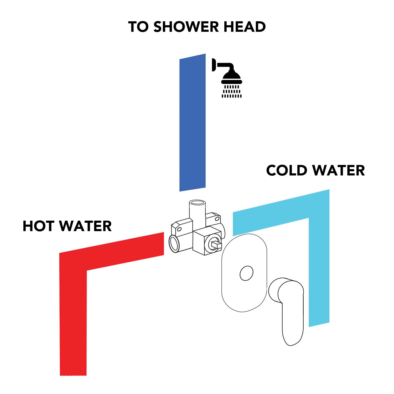 A shower mixer valve has two inputs, one for hot water and one for cold water. These two inputs are mixed together to the temperature you have selected with the easy-to-use single lever or knobs.